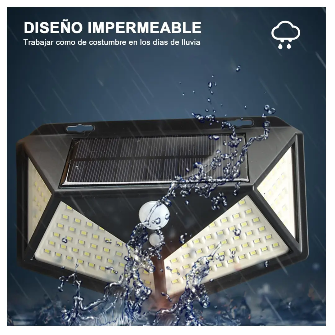 Esta luz solar LED de 100 LEDs funciona sin cables, sin electricidad, y se carga automáticamente con energía solar. Es resistente, impermeable IP65 y perfecta para exteriores como patios, jardines, cocheras, entradas y más.